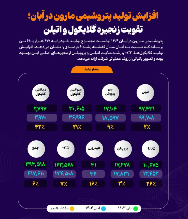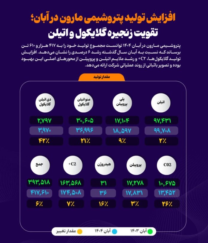 عملکرد تولیدی پتروشیمی مارون در آبان ۱۴۰۴ نشاندهنده ادامه روند بهبود در ظرفیت عملیاتی این شرکت است. مجموع تولید ماهانه که در آبان ۱۴۰۳ حدود ۳۹۳ هزار و ۵۱۸ تن ثبت شده بود، در آبان امسال با رشد ۶ درصدی به ۴۱۷ هزار و ۶۱۰ تن رسید. این افزایش هرچند آرام اما فراگیر بوده و در بخشهای مختلف سبد محصول شرکت مشاهده میشود.