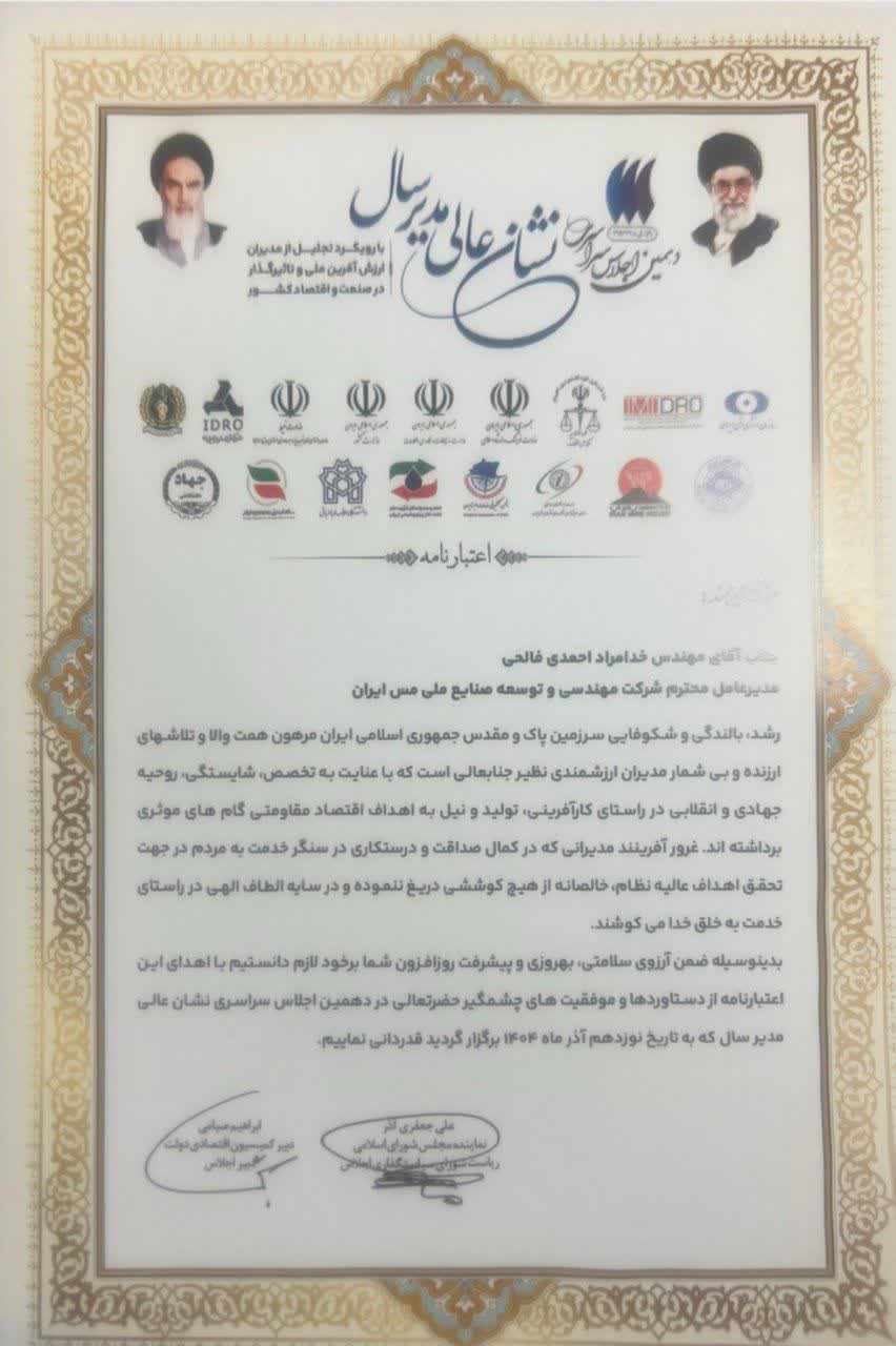 در دهمین اجلاس سراسری «نشان عالی»، خدامراد احمدی مدیرعامل شرکت مهندسی و توسعه صنایع ملی مس ایران (متمم)، با رأی هیئت داوران و بر اساس ارزیابی دقیق شاخصهای کلیدی مدیریت، نوآوری، بهرهوری سازمانی و مسئولیتپذیری اجتماعی، بهعنوان مدیر برتر سال ۱۴۰۴ کشور معرفی و موفق به دریافت نشان عالی مدیریت شد.