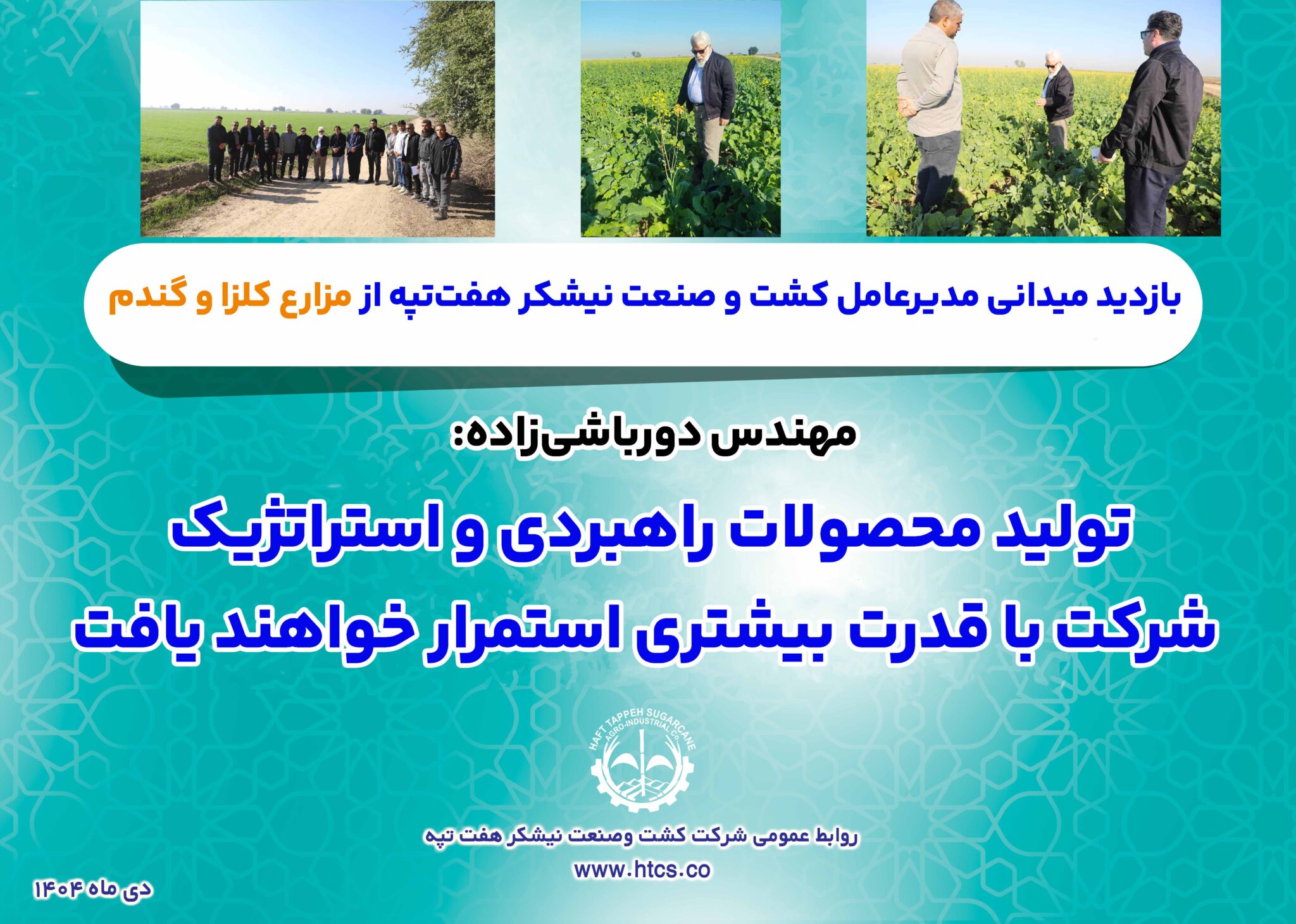 مهندس دورباشیزاده با تأکید بر جایگاه ویژه محصولات راهبردی شرکت از قبیل کلزا و گندم در تأمین امنیت غذایی کشور، بر ضرورت تداوم نظارت میدانی، مدیریت علمی مزارع، افزایش بهرهوری و ارتقای کیفیت تولید تأکید و تلاشهای شبانهروزی کارکنان خدوم حوزه کشاورزی را قابل تقدیر توصیف نمود.